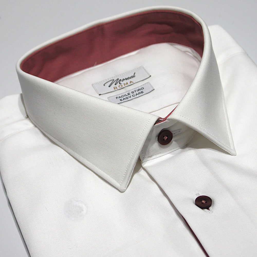 The classic Italian Zurich collar is a symbol of elegance and refinement: with its clean and proportionate lines, it is an ideal choice for formal and professional contexts. It is perfect for wearing with a tie, enhancing business or formal outfits, but also maintains harmony and sobriety when worn without accessories. Embellished with contrasting fabric on the inside, it becomes a truly distinctive feature. The classic bevelled cuff completes the design with discretion and tradition, but always with the added value of the contrasting fabric. Its slightly rounded shape makes the shirt versatile and always appropriate, balancing the elegant look of the collar with a sober and timeless touch. The burgundy buttons make this garment unique.