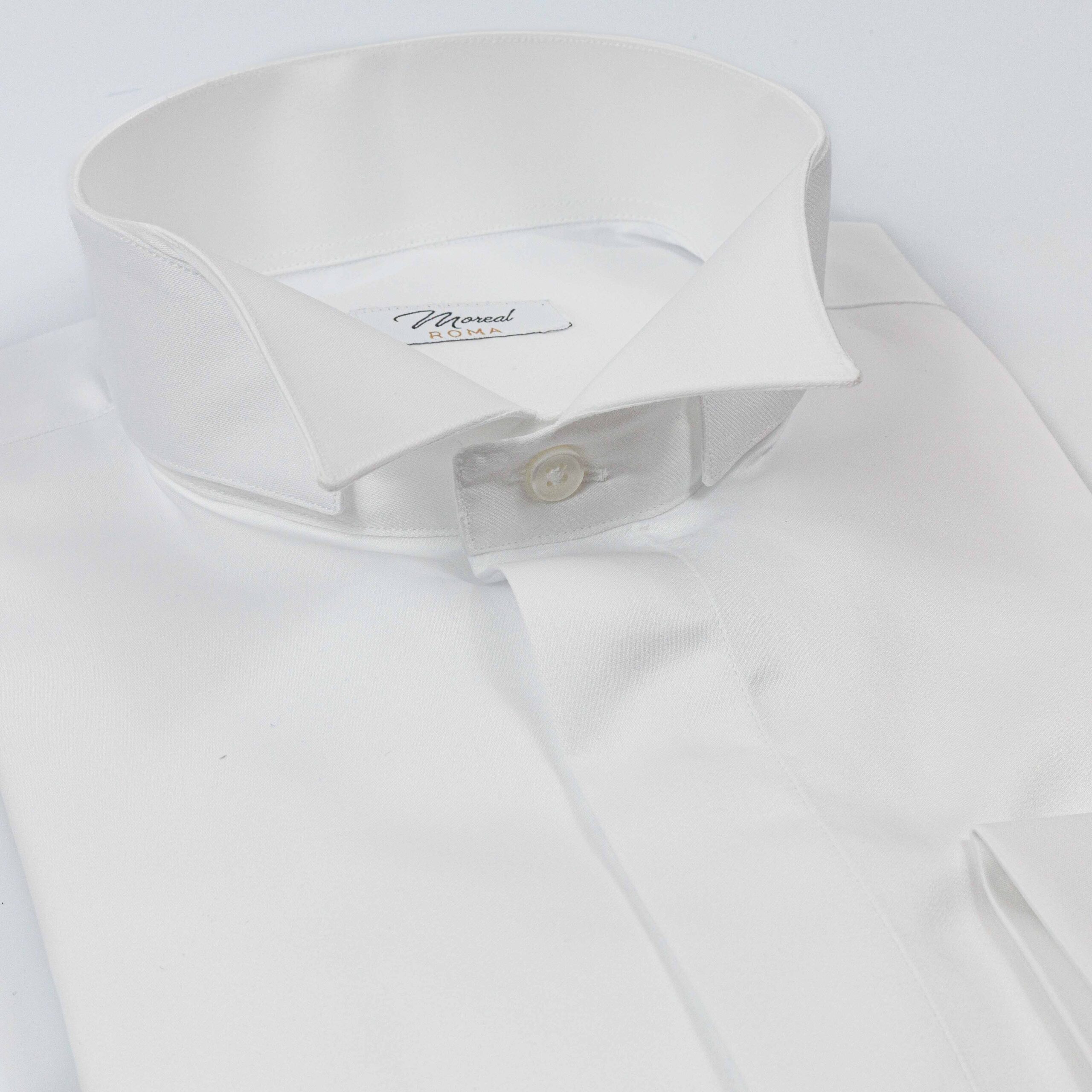 Camicia da cerimonia Moreal Roma modello Smoking2 in raso bianco 100% cotone. Collo smoking doppio con copertura per fettuccia accessorio, polsini doppi da gemello e bottoni neri a gemello con gemelli inclusi. Elegante e perfetta per eventi formali e di gala.