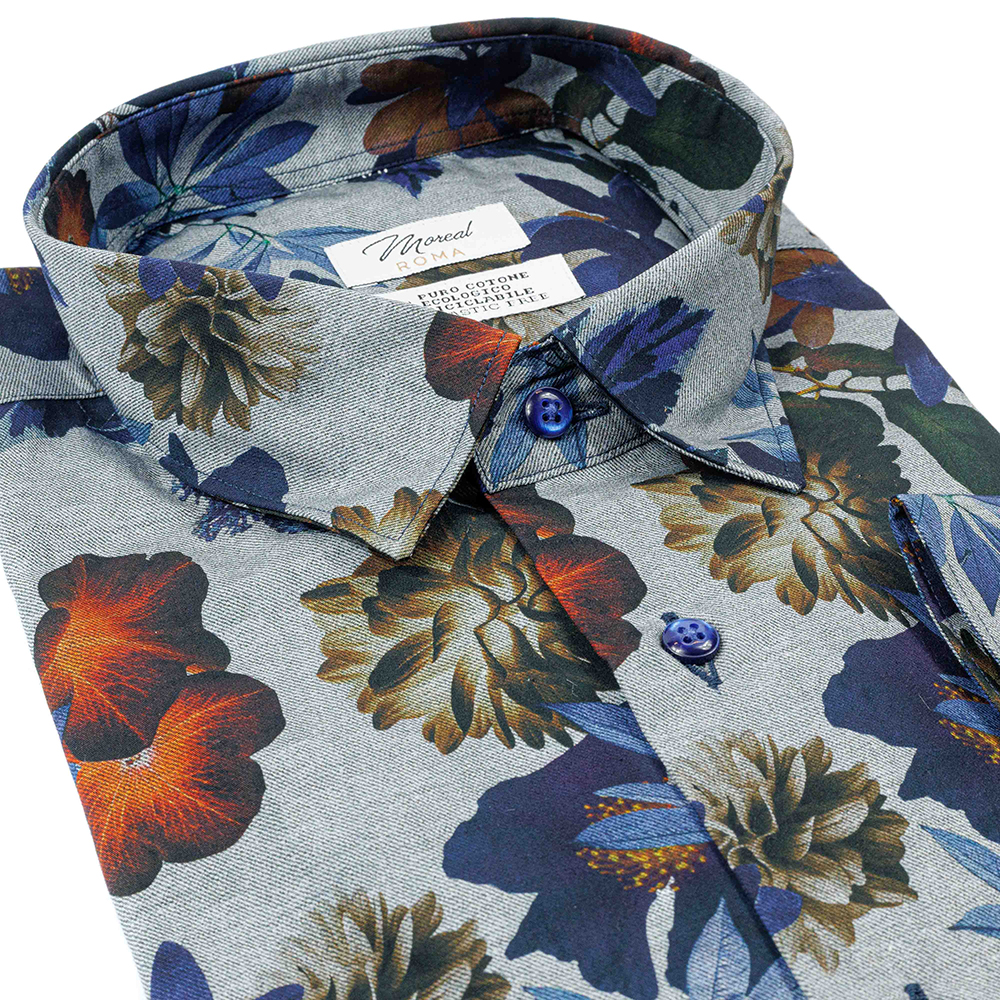 La camicia in twill grigio con fantasia fiori blu e marroni di Moreal Camicie Roma unisce raffinatezza e calore, pensata per l’uomo che cerca eleganza e comfort nelle stagioni più fresche. Realizzata in 100% cotone, il tessuto twill presenta una trama sottile e poco evidente con righini trasversali, che conferisce al capo morbidezza, resistenza e un aspetto sofisticato.