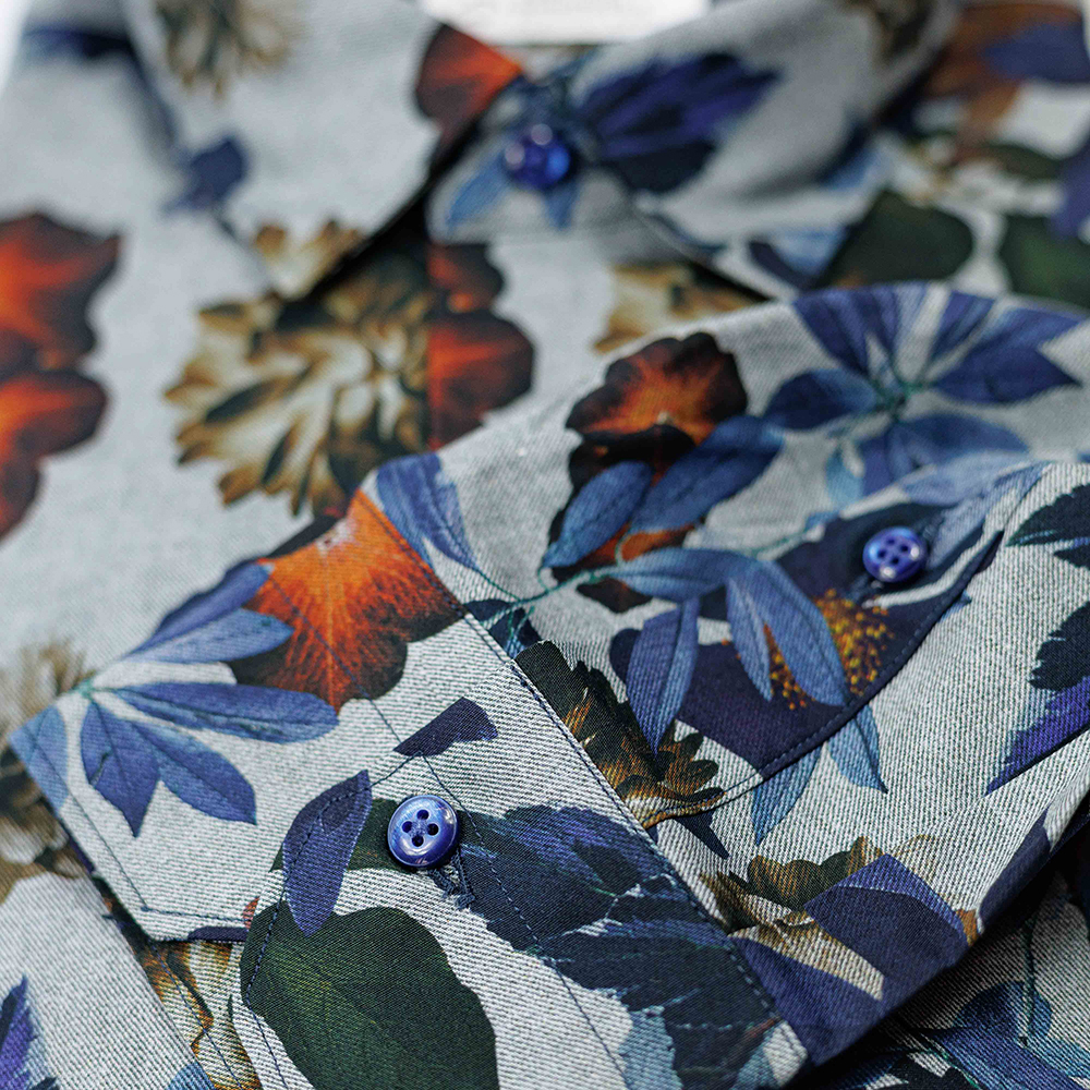 Camicia in twill grigio con fantasia fiori blu e marroni, elegante e confortevole, perfetta per autunno, inverno e primavera.