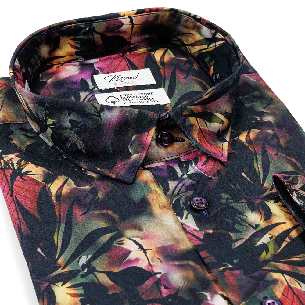 La camicia in popeline nero fantasia foglie flash fuxia di Moreal Camicie è un capo dal carattere deciso e contemporaneo, pensato per chi ama distinguersi con stile. Realizzata in 100% cotone, sfrutta le qualità del popeline: un tessuto liscio, leggero e compatto, che garantisce comfort, traspirabilità e una vestibilità sempre ordinata, ideale per primavera, estate e autunno.