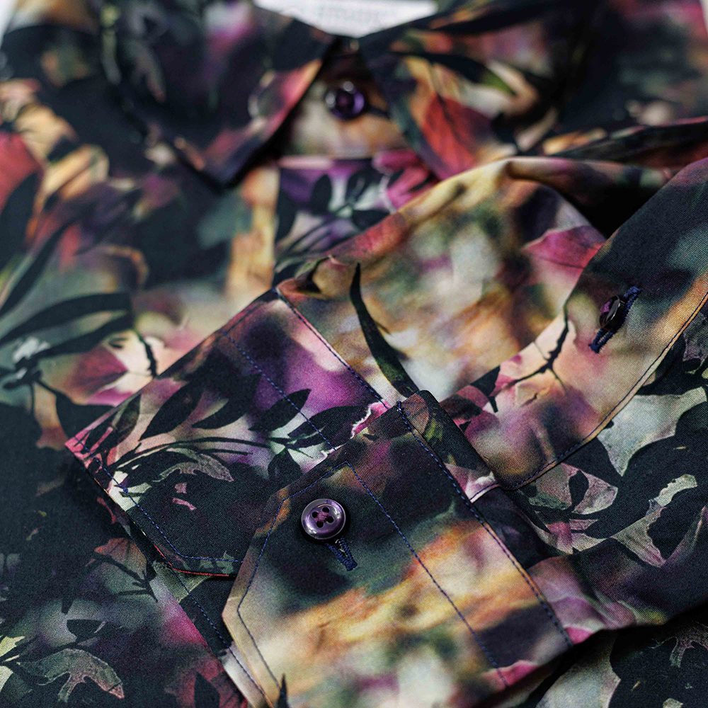 Il fondo nero, arricchito da una vivace fantasia di foglie fuxia, crea un contrasto elegante e moderno che dona personalità a qualsiasi outfit, senza risultare eccessivo. Il collo Zurigo morbido e sportivo e i polsini smussati leggeri conferiscono un tocco casual-chic, rendendo questa camicia adatta sia a momenti di relax che a situazioni più curate.